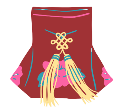 Suelen estar bordados con caracteres chinos de palabras como 福 (Suerte), 富 (Riqueza) y 貴 (Nobleza) entre otros.